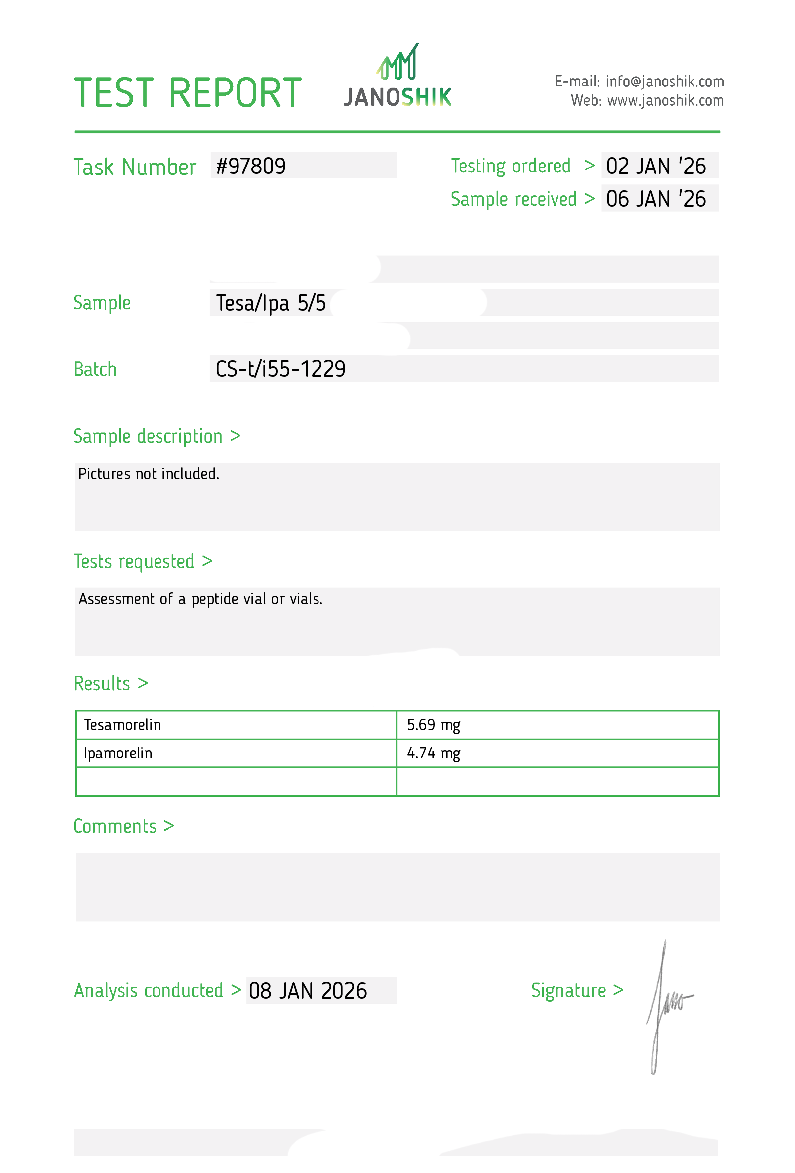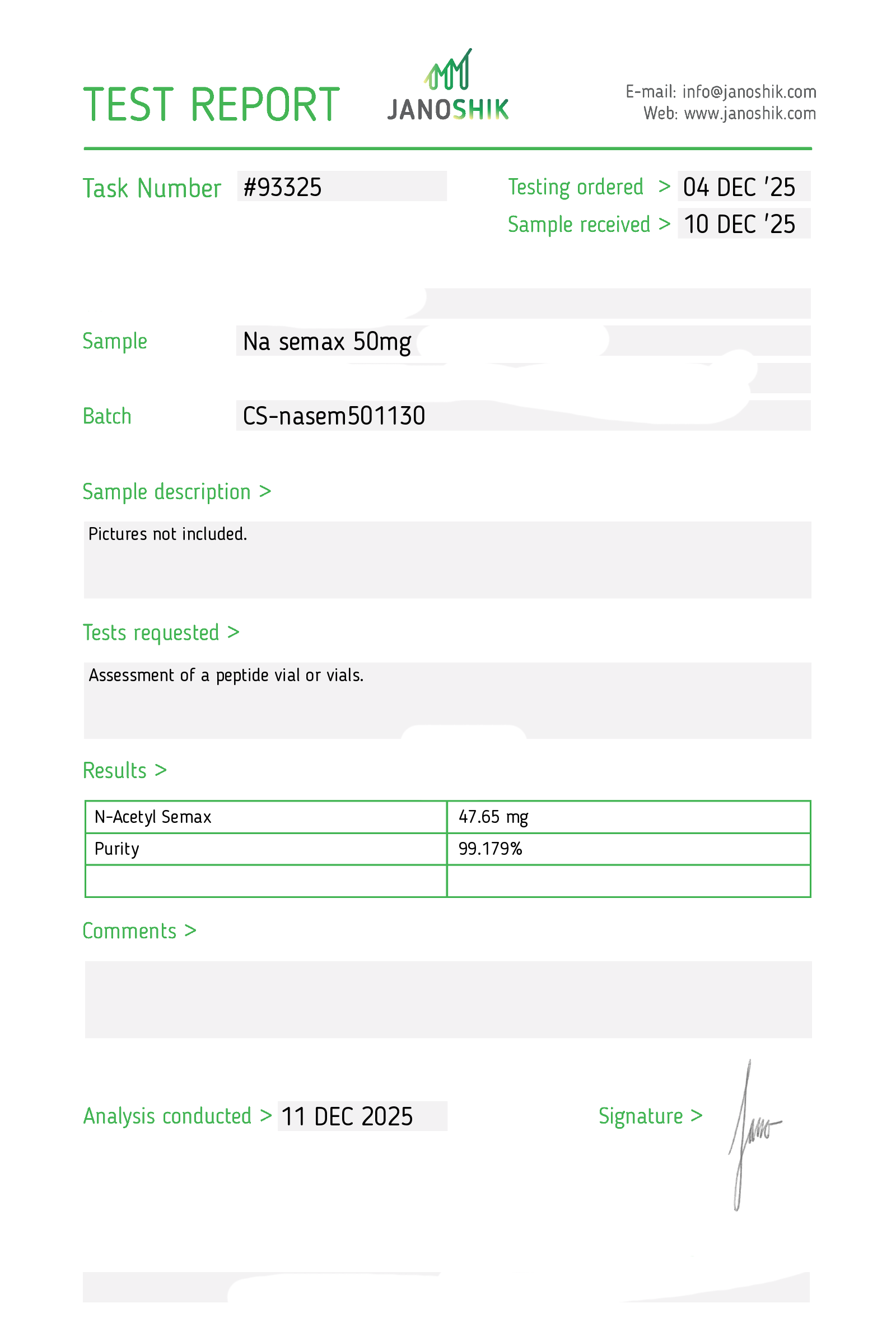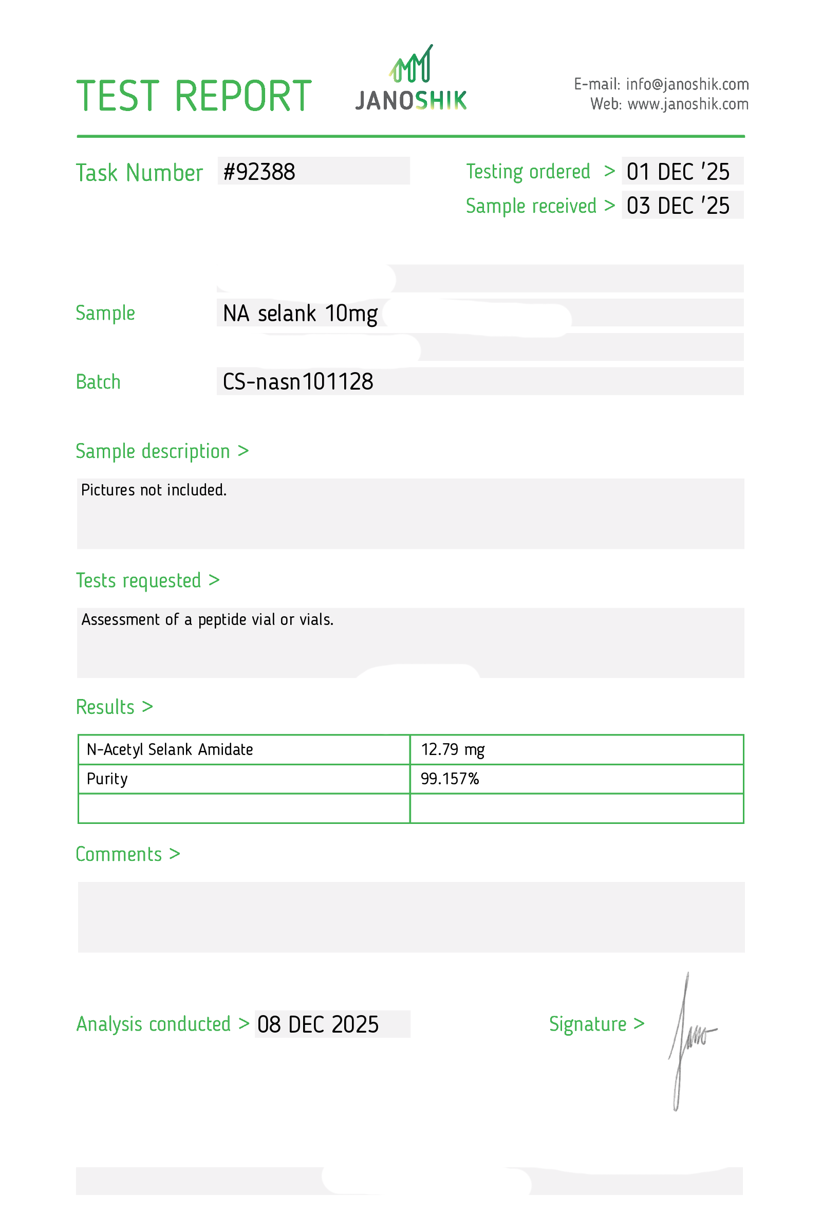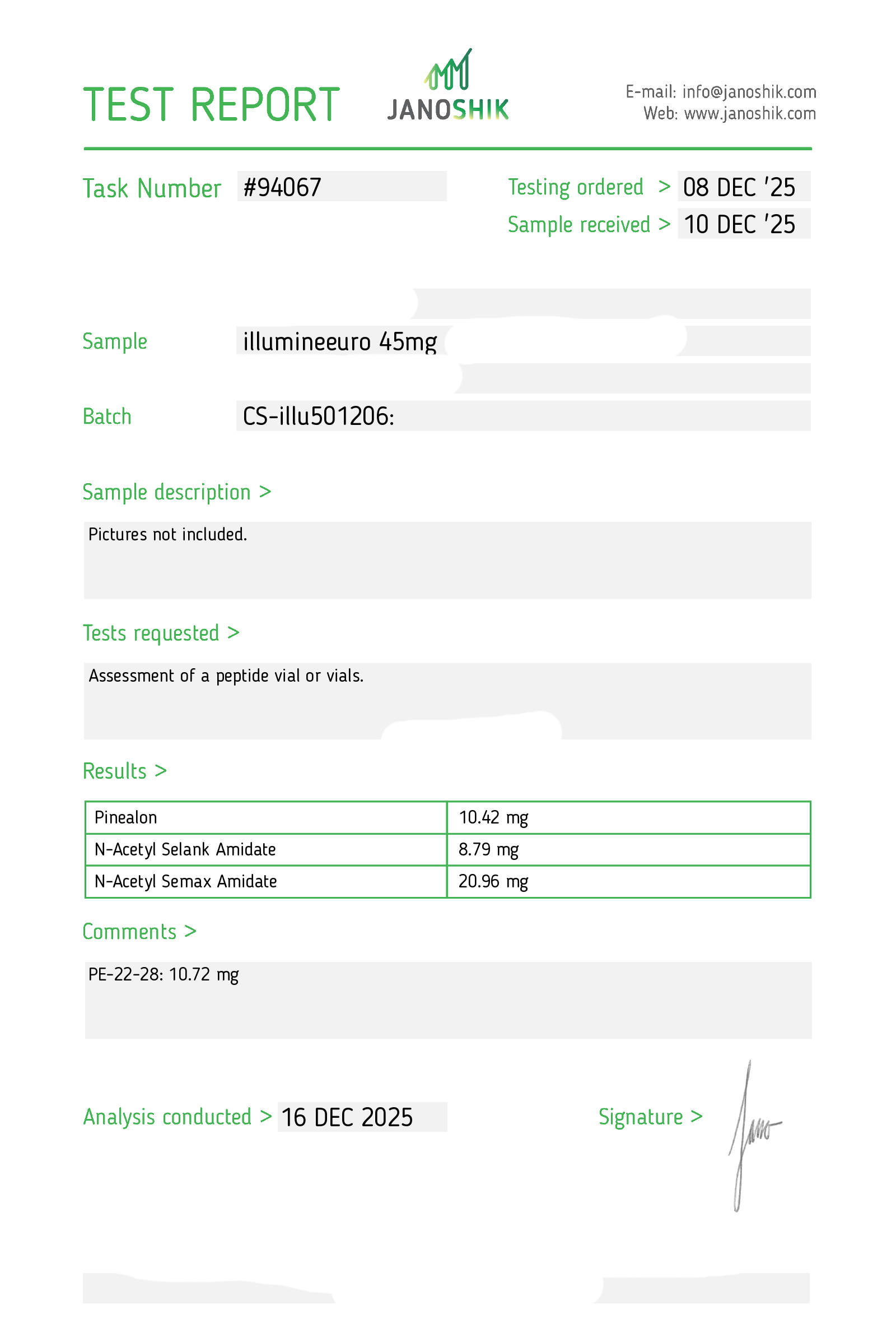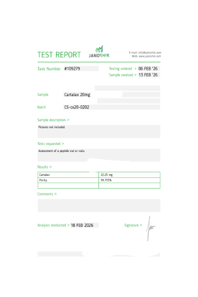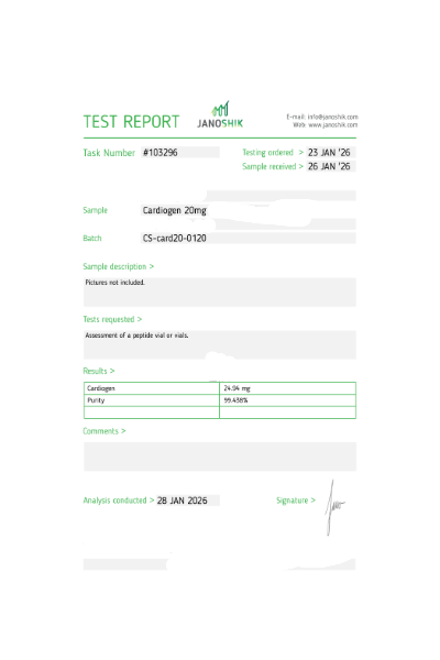 Certificates of Analysis (COA) Certificates of Analysis (COA'S) All products are third-party tested to ensure purity, accuracy, and quality. Bronchogen 20mg View cOA Cartalax 20mg View cOA Epithalon 50mg View cOA Chonluten 20mg View cOA ILLUMINEURO Pinealon/NA Selank/NA Semax/ Pe22-28 50mg (BLEND) View cOA Cardiogen 20mg View cOA N-Acetyl Epithalon Amidate 20mg View cOA Ovagen 20mg View cOA Pancragen 20mg View cOA Pinealon 20mg View cOA ADIPOTIDE View cOA AOD-9604 5MG View cOA ARA-290 16MG View cOA BPC-157 40MG View cOA BPC-157 10MG View cOA CJC-1295, IPAMORELIN 5/5 View cOA CJC-1295, IPAMORELIN 10/10 View cOA CJC-1295 with DAC 5mg View cOA DSIP 5mg View cOA Epithalon (Epitalon) 50mg View cOA FOX04 10MG View cOA GHK-Cu 50mg Copper Peptide View cOA GHRP-2 10mg View cOA GHRP-6 10mg View cOA BPC-157, TB-500, GHK-Cu 70mg View cOA L-Glutathione 600mg View cOA Humanin 10mg View cOA IGF-1 LR3 1MG View cOA Pinealon/NA Selank/NA Semax/ Pe22-28 50mg View cOA Ipamorelin 10mg View cOA KPV (Ac-KPV-NH2) 30mg View cOA LL-37 5mg (CAP-18) View cOA MOTS-c 10mg View cOA Melanotan I (MT I) 10mg View cOA Melanotan II (MT II) 10mg View cOA N-Acetyl Epithalon Amidate 20mg View cOA N-Acetyl Selank Amidate 10mg View cOA NA SEMAX 10MG View cOA NA SEMAX 50MG View cOA NAD+ 500mg View cOA OVAGEN 20MG View cOA OXYTOCIN 10MG View cOA PANCRAGEN 20MG View cOA Pinealon 20mg View cOA PROSTAMAX 20MG View cOA PT-141 10mg View cOA SELANK 10MG View cOA SERMORELIN 5MG View cOA Tesamorelin, CJC-1295 (no DAC), Ipamorelin 12mg View cOA Tesamorelin 10mg View cOA Tesamorelin, Ipamorelin 10mg View cOA Tesamorelin, CJC-1295 (no DAC), Ipamorelin 12mg View cOA Testagen 20mg View cOA THYMOSIN 10MG View cOA VESILUTE 20MG View cOA VESUGEN 20MG View cOA