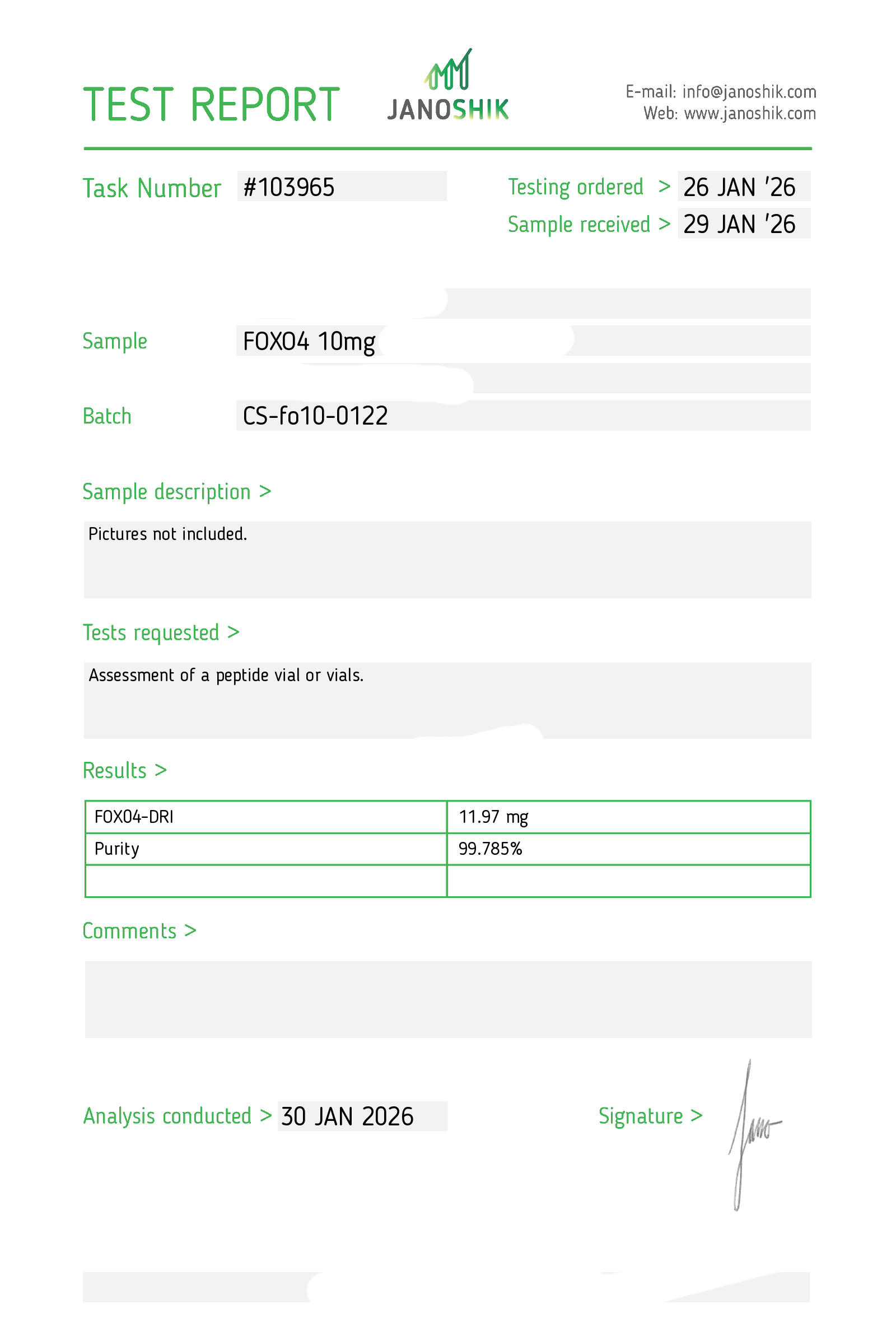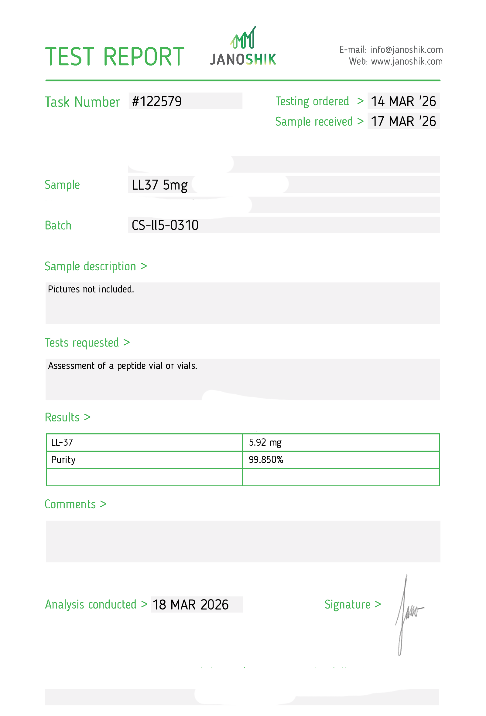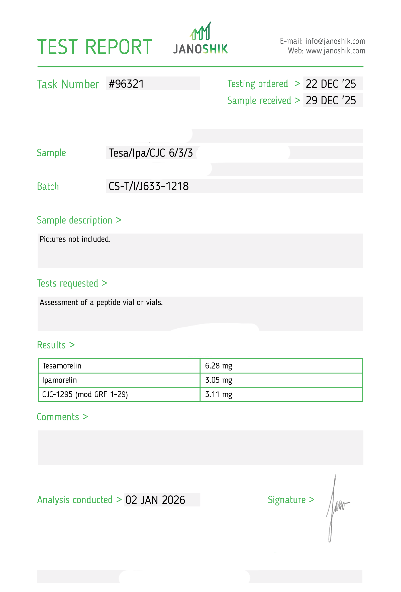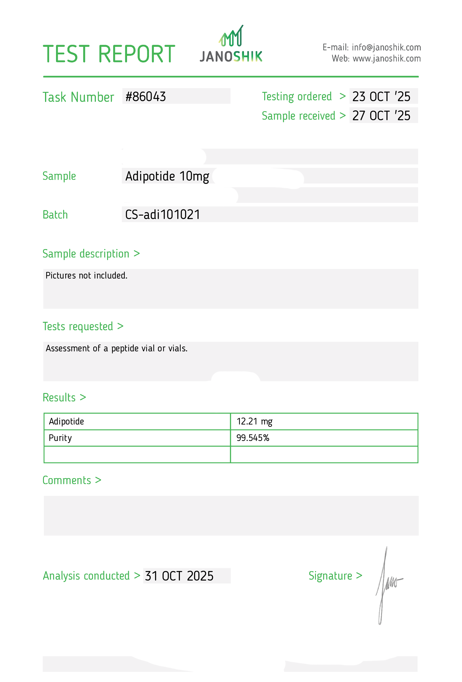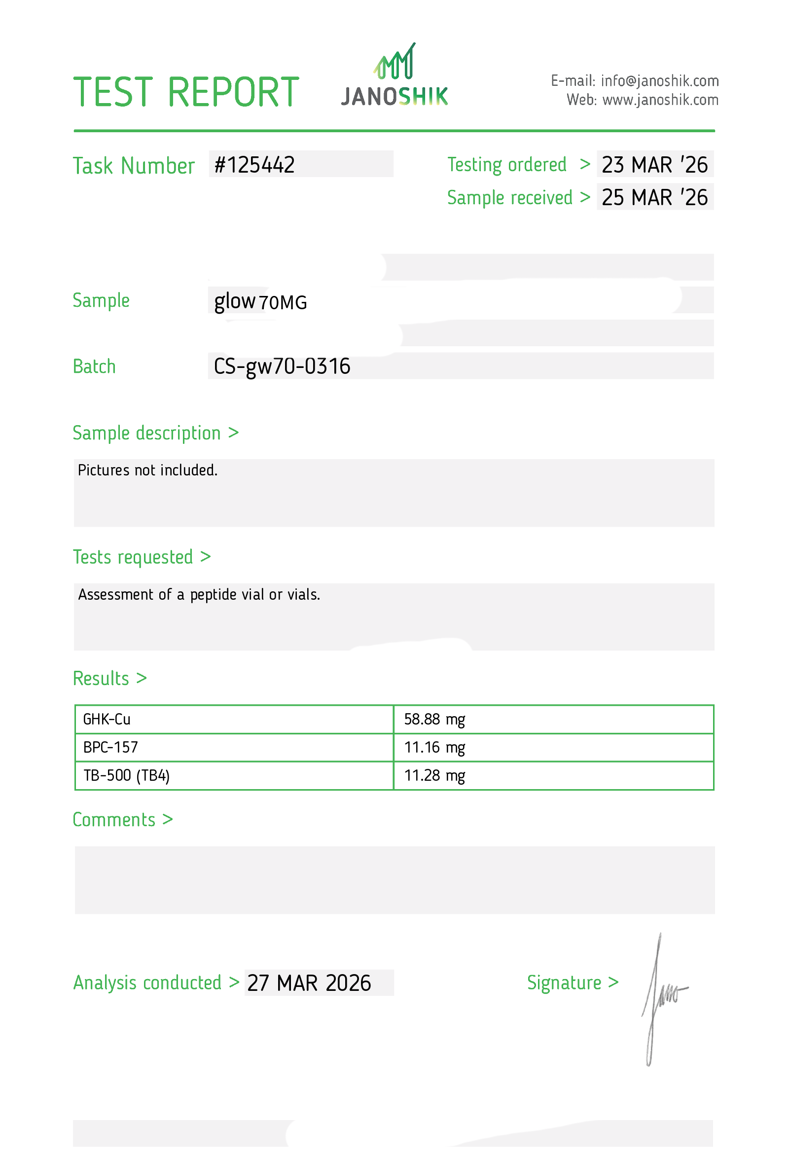 Certificates of Analysis (COA) Certificates of Analysis (COA'S) All products are third-party tested to ensure purity, accuracy, and quality. Bronchogen 20mg View cOA Cartalax 20mg View cOA Epithalon 50mg View cOA Chonluten 20mg View cOA ILLUMINEURO Pinealon/NA Selank/NA Semax/ Pe22-28 50mg (BLEND) View cOA Cardiogen 20mg View cOA N-Acetyl Epithalon Amidate 20mg View cOA Ovagen 20mg View cOA Pancragen 20mg View cOA Pinealon 20mg View cOA ADIPOTIDE View cOA AOD-9604 5MG View cOA ARA-290 16MG View cOA BPC-157 40MG View cOA BPC-157 10MG View cOA CJC-1295, IPAMORELIN 5/5 View cOA CJC-1295, IPAMORELIN 10/10 View cOA CJC-1295 with DAC 5mg View cOA DSIP 5mg View cOA Epithalon (Epitalon) 50mg View cOA FOX04 10MG View cOA GHK-Cu 50mg Copper Peptide View cOA GHRP-2 10mg View cOA GHRP-6 10mg View cOA BPC-157, TB-500, GHK-Cu 70mg View cOA L-Glutathione 600mg View cOA Humanin 10mg View cOA IGF-1 LR3 1MG View cOA Pinealon/NA Selank/NA Semax/ Pe22-28 50mg View cOA Ipamorelin 10mg View cOA KPV (Ac-KPV-NH2) 30mg View cOA LL-37 5mg (CAP-18) View cOA MOTS-c 10mg View cOA Melanotan I (MT I) 10mg View cOA Melanotan II (MT II) 10mg View cOA N-Acetyl Epithalon Amidate 20mg View cOA N-Acetyl Selank Amidate 10mg View cOA NA SEMAX 10MG View cOA NA SEMAX 50MG View cOA NAD+ 500mg View cOA OVAGEN 20MG View cOA OXYTOCIN 10MG View cOA PANCRAGEN 20MG View cOA Pinealon 20mg View cOA PROSTAMAX 20MG View cOA PT-141 10mg View cOA SELANK 10MG View cOA SERMORELIN 5MG View cOA Tesamorelin, CJC-1295 (no DAC), Ipamorelin 12mg View cOA Tesamorelin 10mg View cOA Tesamorelin, Ipamorelin 10mg View cOA Tesamorelin, CJC-1295 (no DAC), Ipamorelin 12mg View cOA Testagen 20mg View cOA THYMOSIN 10MG View cOA VESILUTE 20MG View cOA VESUGEN 20MG View cOA
