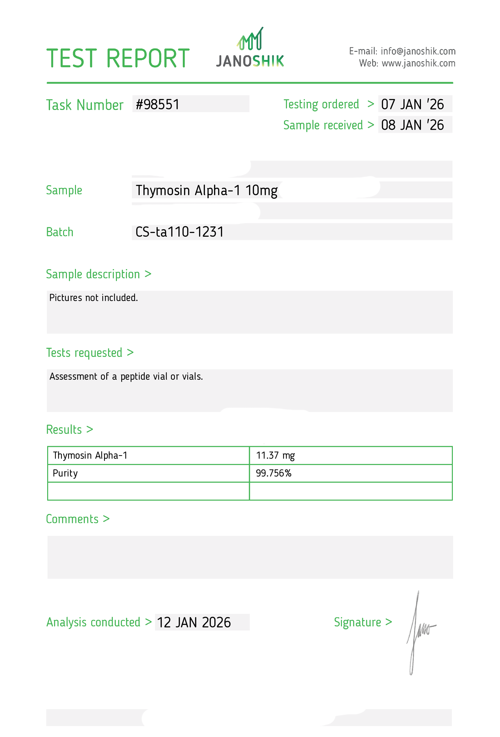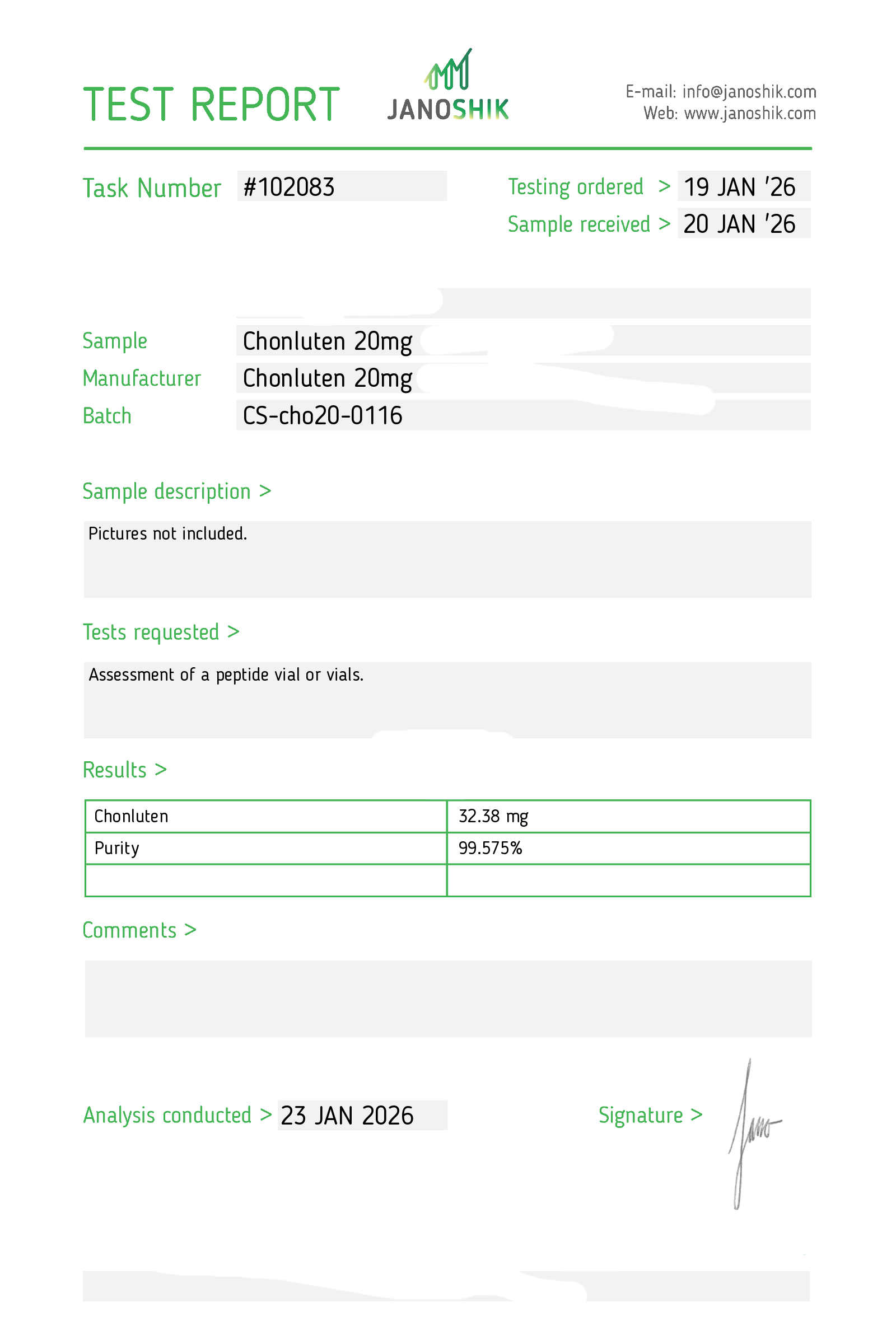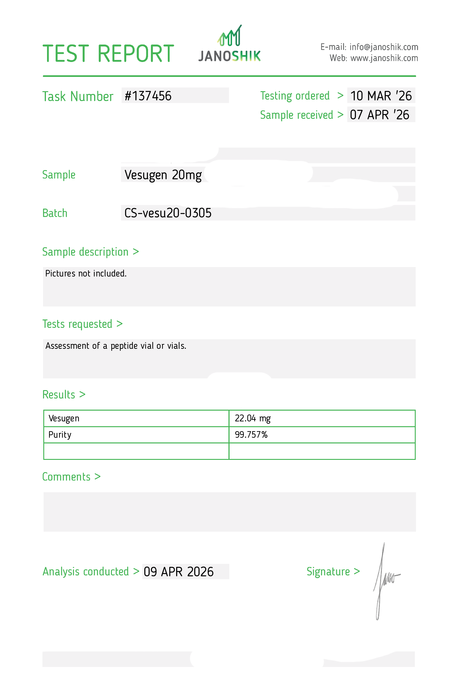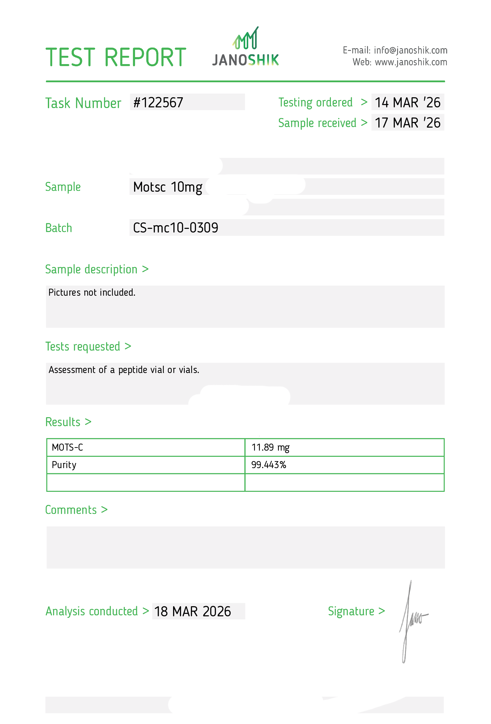 Certificates of Analysis (COA) Certificates of Analysis (COA'S) All products are third-party tested to ensure purity, accuracy, and quality. Bronchogen 20mg View cOA Cartalax 20mg View cOA Epithalon 50mg View cOA Chonluten 20mg View cOA ILLUMINEURO Pinealon/NA Selank/NA Semax/ Pe22-28 50mg (BLEND) View cOA Cardiogen 20mg View cOA N-Acetyl Epithalon Amidate 20mg View cOA Ovagen 20mg View cOA Pancragen 20mg View cOA Pinealon 20mg View cOA ADIPOTIDE View cOA AOD-9604 5MG View cOA ARA-290 16MG View cOA BPC-157 40MG View cOA BPC-157 10MG View cOA CJC-1295, IPAMORELIN 5/5 View cOA CJC-1295, IPAMORELIN 10/10 View cOA CJC-1295 with DAC 5mg View cOA DSIP 5mg View cOA Epithalon (Epitalon) 50mg View cOA FOX04 10MG View cOA GHK-Cu 50mg Copper Peptide View cOA GHRP-2 10mg View cOA GHRP-6 10mg View cOA BPC-157, TB-500, GHK-Cu 70mg View cOA L-Glutathione 600mg View cOA Humanin 10mg View cOA IGF-1 LR3 1MG View cOA Pinealon/NA Selank/NA Semax/ Pe22-28 50mg View cOA Ipamorelin 10mg View cOA KPV (Ac-KPV-NH2) 30mg View cOA LL-37 5mg (CAP-18) View cOA MOTS-c 10mg View cOA Melanotan I (MT I) 10mg View cOA Melanotan II (MT II) 10mg View cOA N-Acetyl Epithalon Amidate 20mg View cOA N-Acetyl Selank Amidate 10mg View cOA NA SEMAX 10MG View cOA NA SEMAX 50MG View cOA NAD+ 500mg View cOA OVAGEN 20MG View cOA OXYTOCIN 10MG View cOA PANCRAGEN 20MG View cOA Pinealon 20mg View cOA PROSTAMAX 20MG View cOA PT-141 10mg View cOA SELANK 10MG View cOA SERMORELIN 5MG View cOA Tesamorelin, CJC-1295 (no DAC), Ipamorelin 12mg View cOA Tesamorelin 10mg View cOA Tesamorelin, Ipamorelin 10mg View cOA Tesamorelin, CJC-1295 (no DAC), Ipamorelin 12mg View cOA Testagen 20mg View cOA THYMOSIN 10MG View cOA VESILUTE 20MG View cOA VESUGEN 20MG View cOA