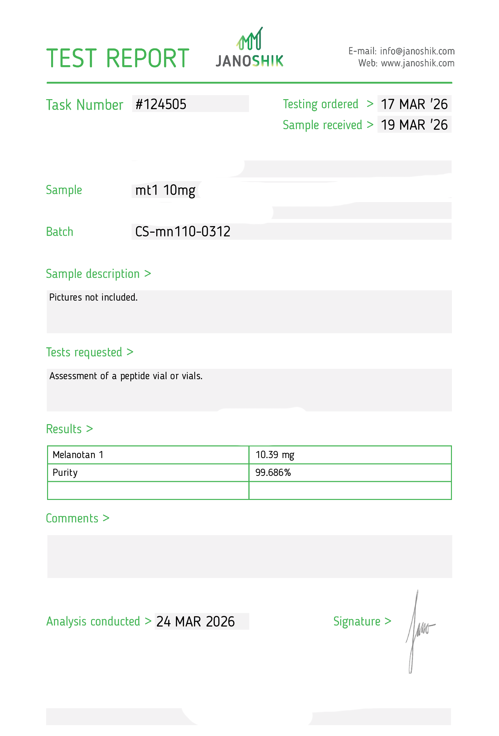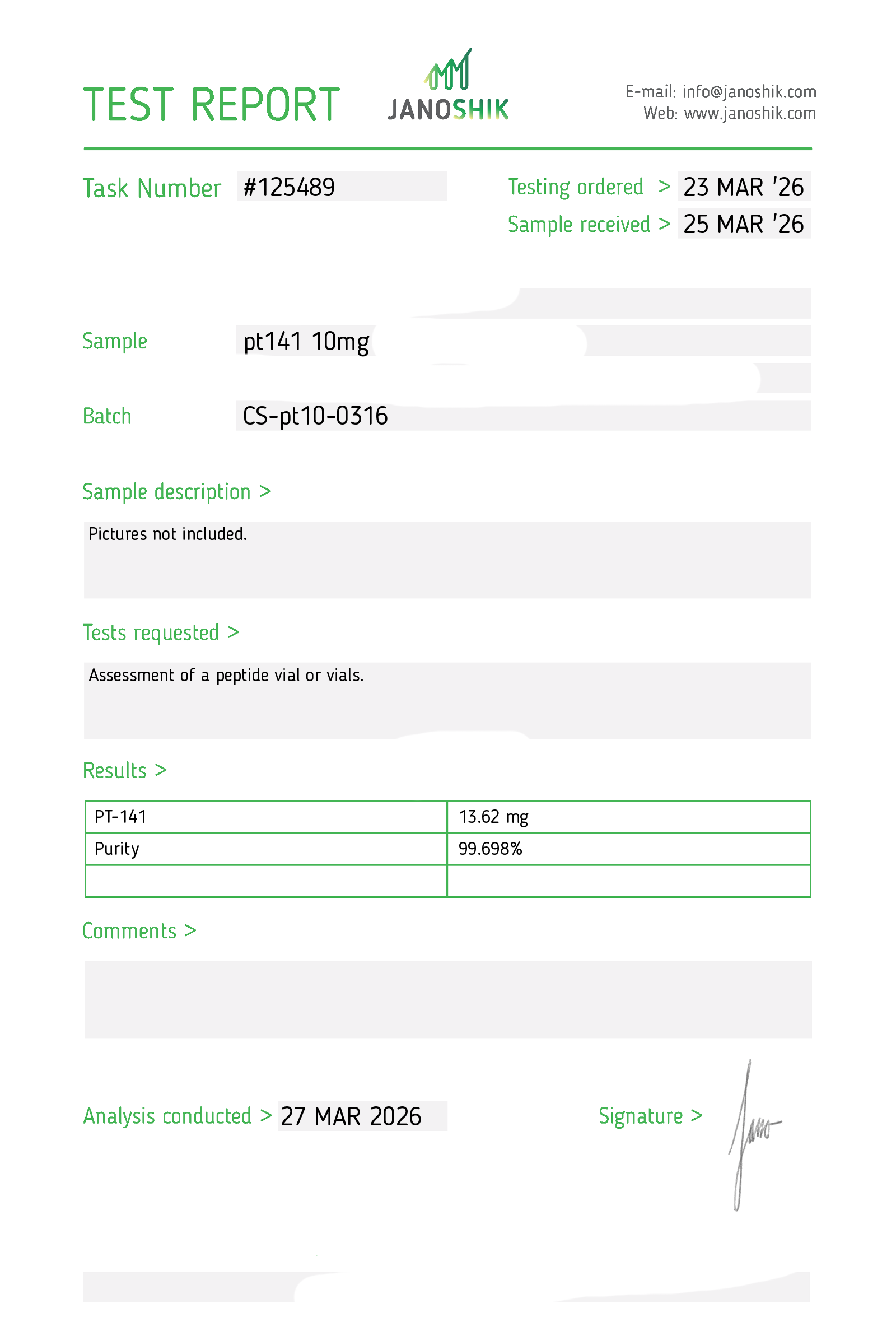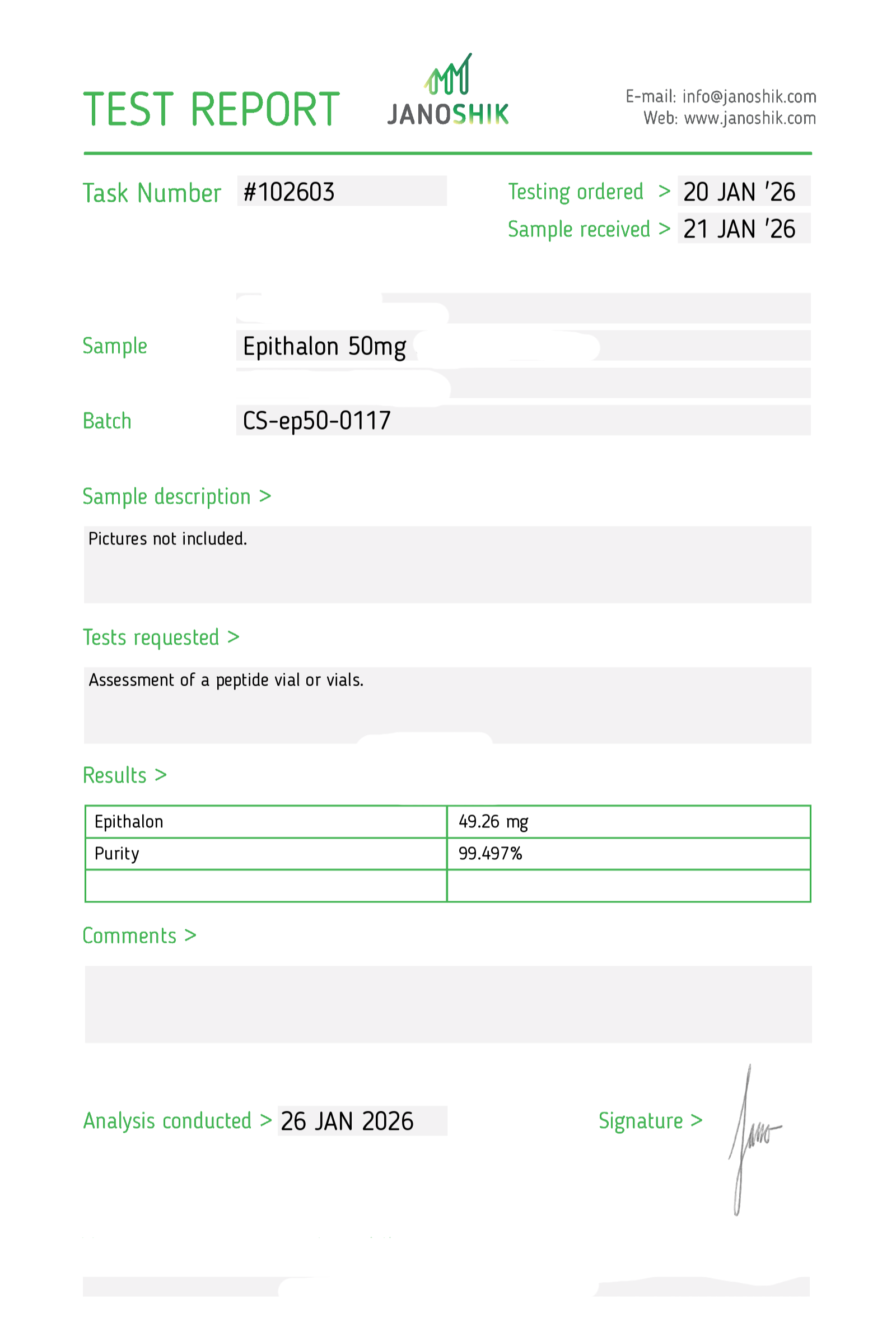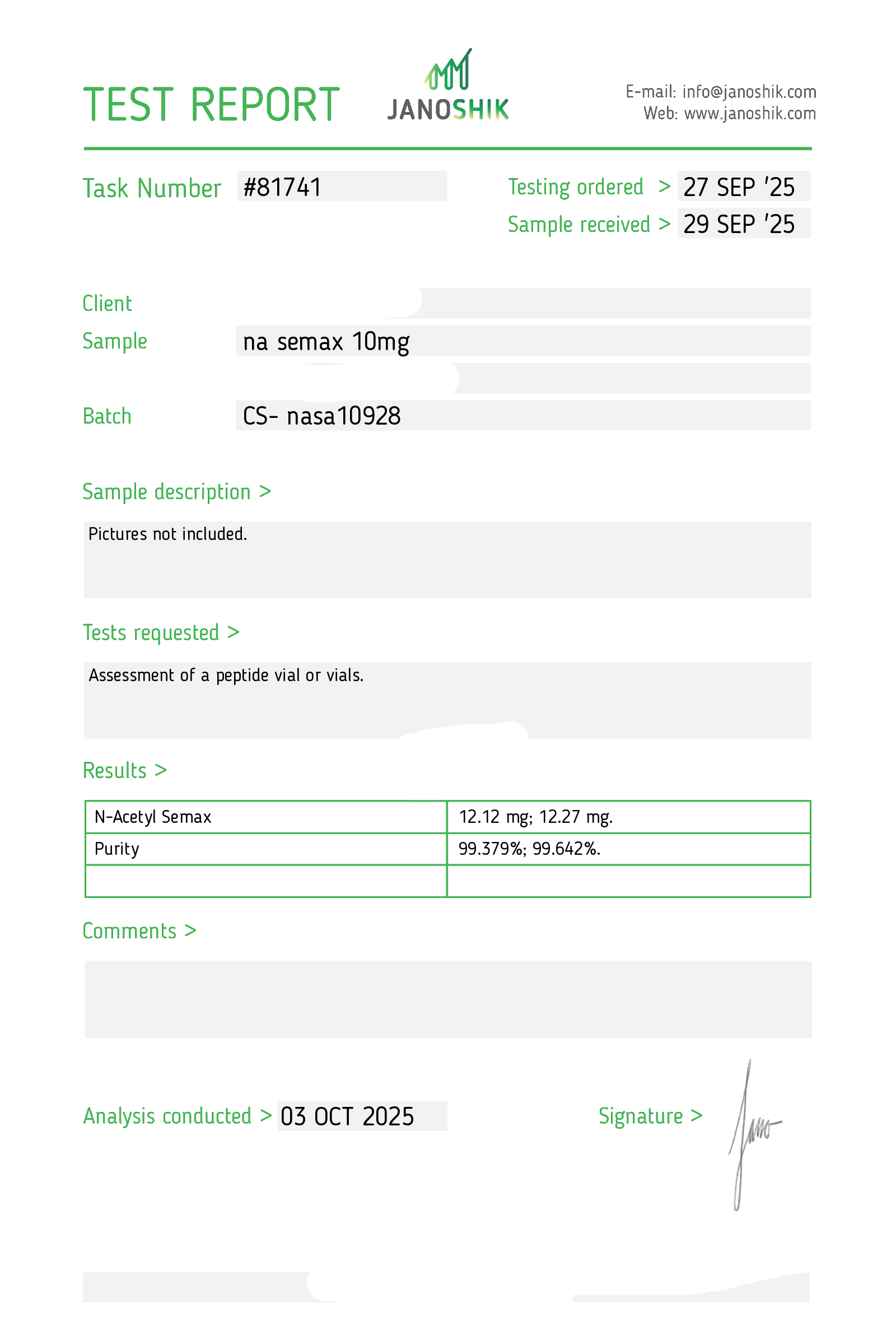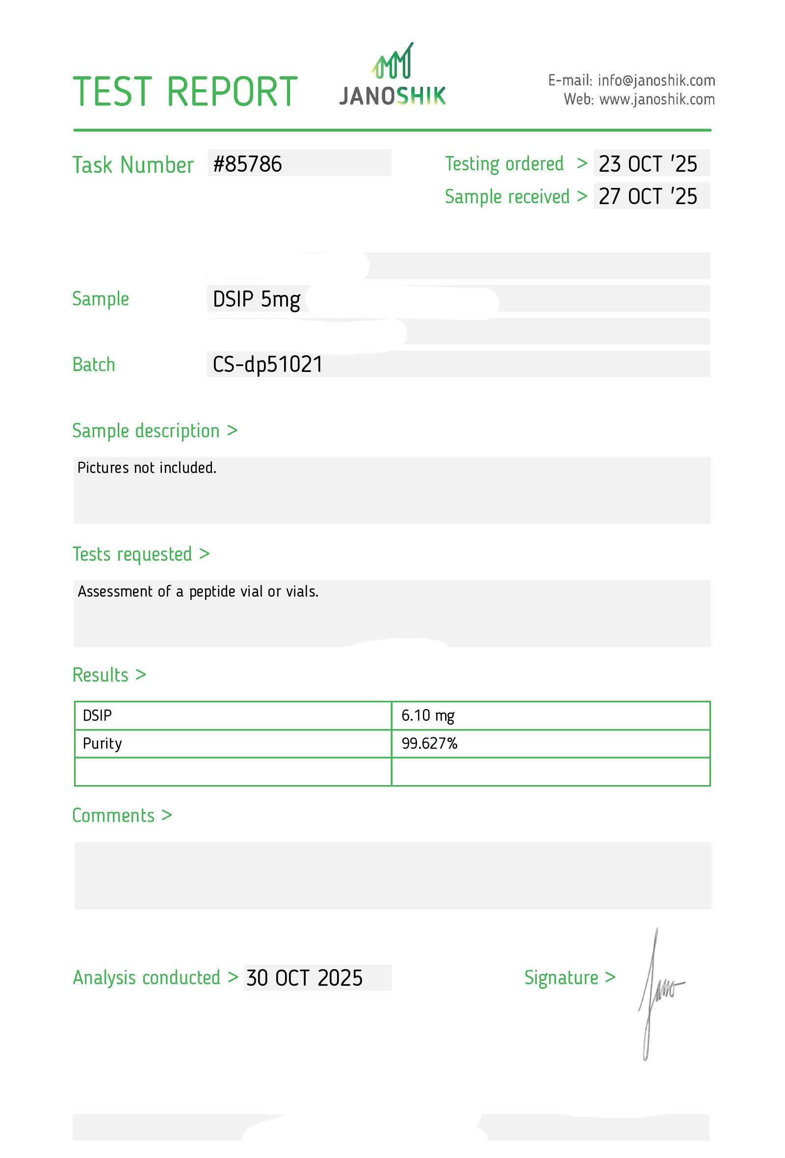Certificates of Analysis (COA) Certificates of Analysis (COA'S) All products are third-party tested to ensure purity, accuracy, and quality. Bronchogen 20mg View cOA Cartalax 20mg View cOA Epithalon 50mg View cOA Chonluten 20mg View cOA ILLUMINEURO Pinealon/NA Selank/NA Semax/ Pe22-28 50mg (BLEND) View cOA Cardiogen 20mg View cOA N-Acetyl Epithalon Amidate 20mg View cOA Ovagen 20mg View cOA Pancragen 20mg View cOA Pinealon 20mg View cOA ADIPOTIDE View cOA AOD-9604 5MG View cOA ARA-290 16MG View cOA BPC-157 40MG View cOA BPC-157 10MG View cOA CJC-1295, IPAMORELIN 5/5 View cOA CJC-1295, IPAMORELIN 10/10 View cOA CJC-1295 with DAC 5mg View cOA DSIP 5mg View cOA Epithalon (Epitalon) 50mg View cOA FOX04 10MG View cOA GHK-Cu 50mg Copper Peptide View cOA GHRP-2 10mg View cOA GHRP-6 10mg View cOA BPC-157, TB-500, GHK-Cu 70mg View cOA L-Glutathione 600mg View cOA Humanin 10mg View cOA IGF-1 LR3 1MG View cOA Pinealon/NA Selank/NA Semax/ Pe22-28 50mg View cOA Ipamorelin 10mg View cOA KPV (Ac-KPV-NH2) 30mg View cOA LL-37 5mg (CAP-18) View cOA MOTS-c 10mg View cOA Melanotan I (MT I) 10mg View cOA Melanotan II (MT II) 10mg View cOA N-Acetyl Epithalon Amidate 20mg View cOA N-Acetyl Selank Amidate 10mg View cOA NA SEMAX 10MG View cOA NA SEMAX 50MG View cOA NAD+ 500mg View cOA OVAGEN 20MG View cOA OXYTOCIN 10MG View cOA PANCRAGEN 20MG View cOA Pinealon 20mg View cOA PROSTAMAX 20MG View cOA PT-141 10mg View cOA SELANK 10MG View cOA SERMORELIN 5MG View cOA Tesamorelin, CJC-1295 (no DAC), Ipamorelin 12mg View cOA Tesamorelin 10mg View cOA Tesamorelin, Ipamorelin 10mg View cOA Tesamorelin, CJC-1295 (no DAC), Ipamorelin 12mg View cOA Testagen 20mg View cOA THYMOSIN 10MG View cOA VESILUTE 20MG View cOA VESUGEN 20MG View cOA
