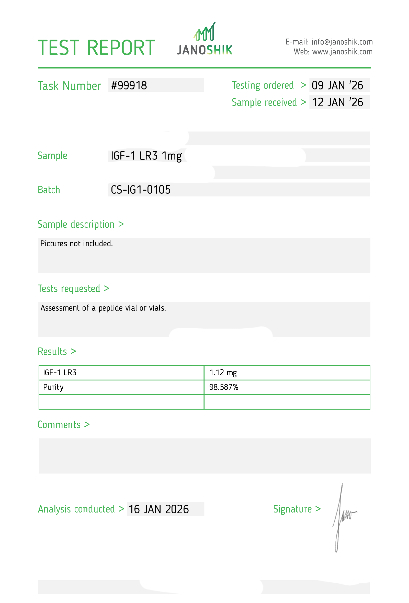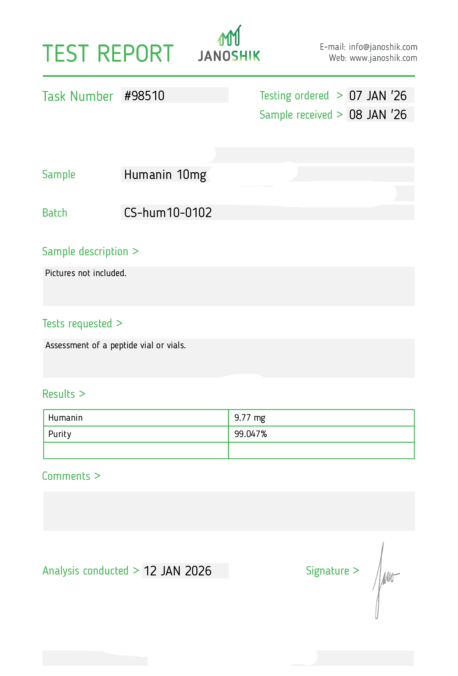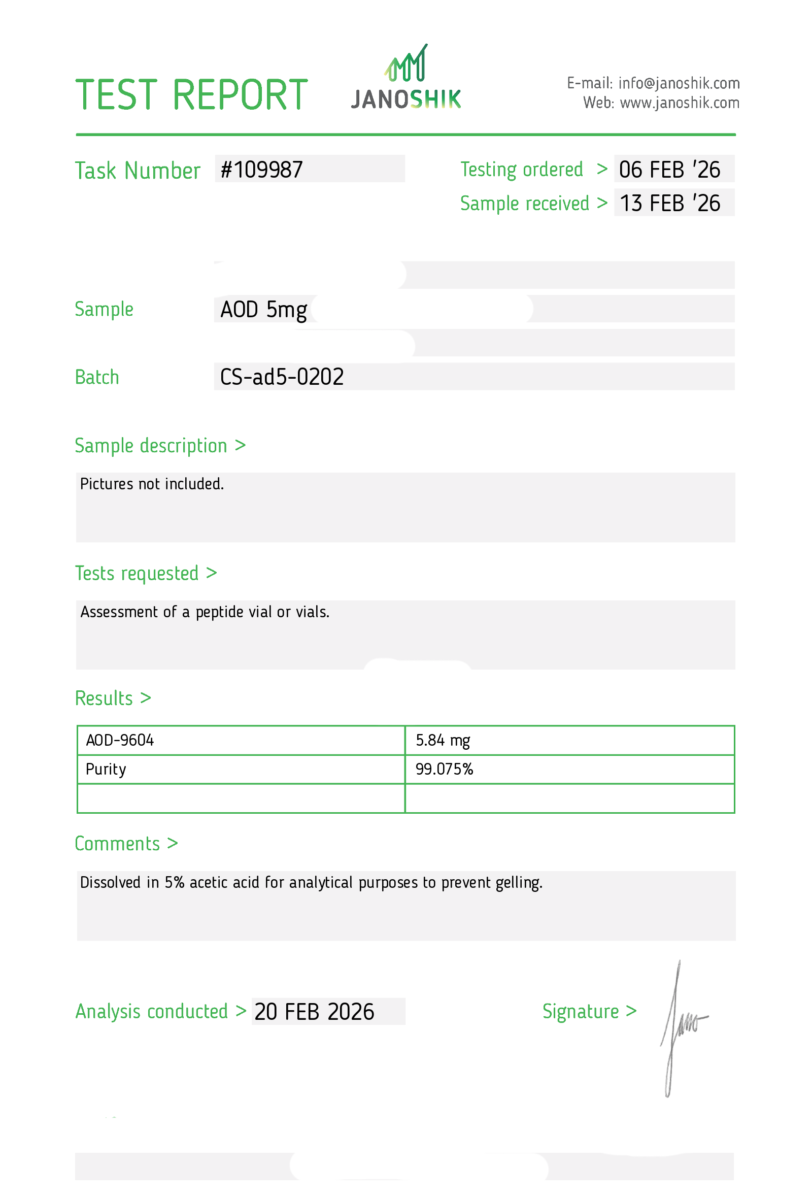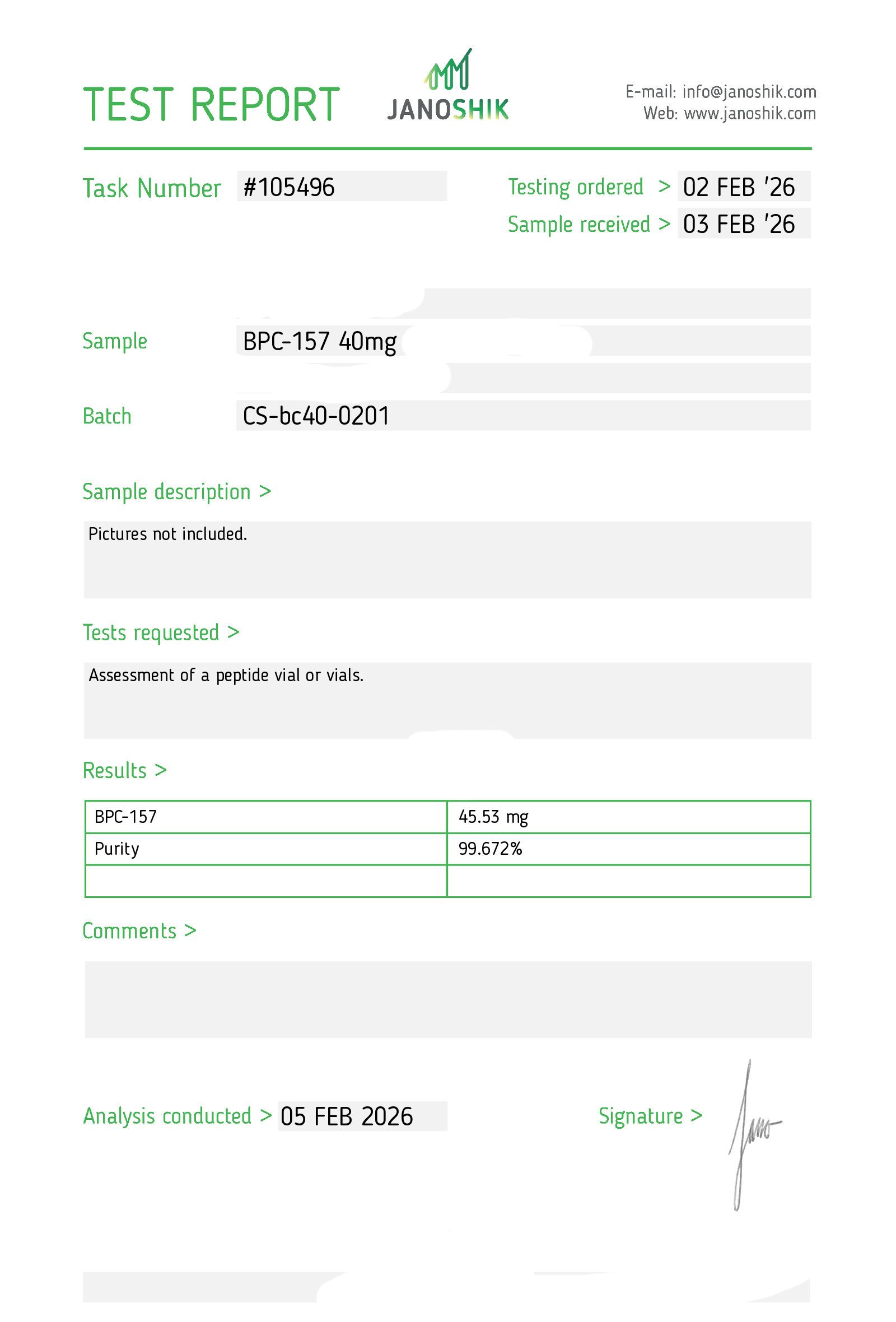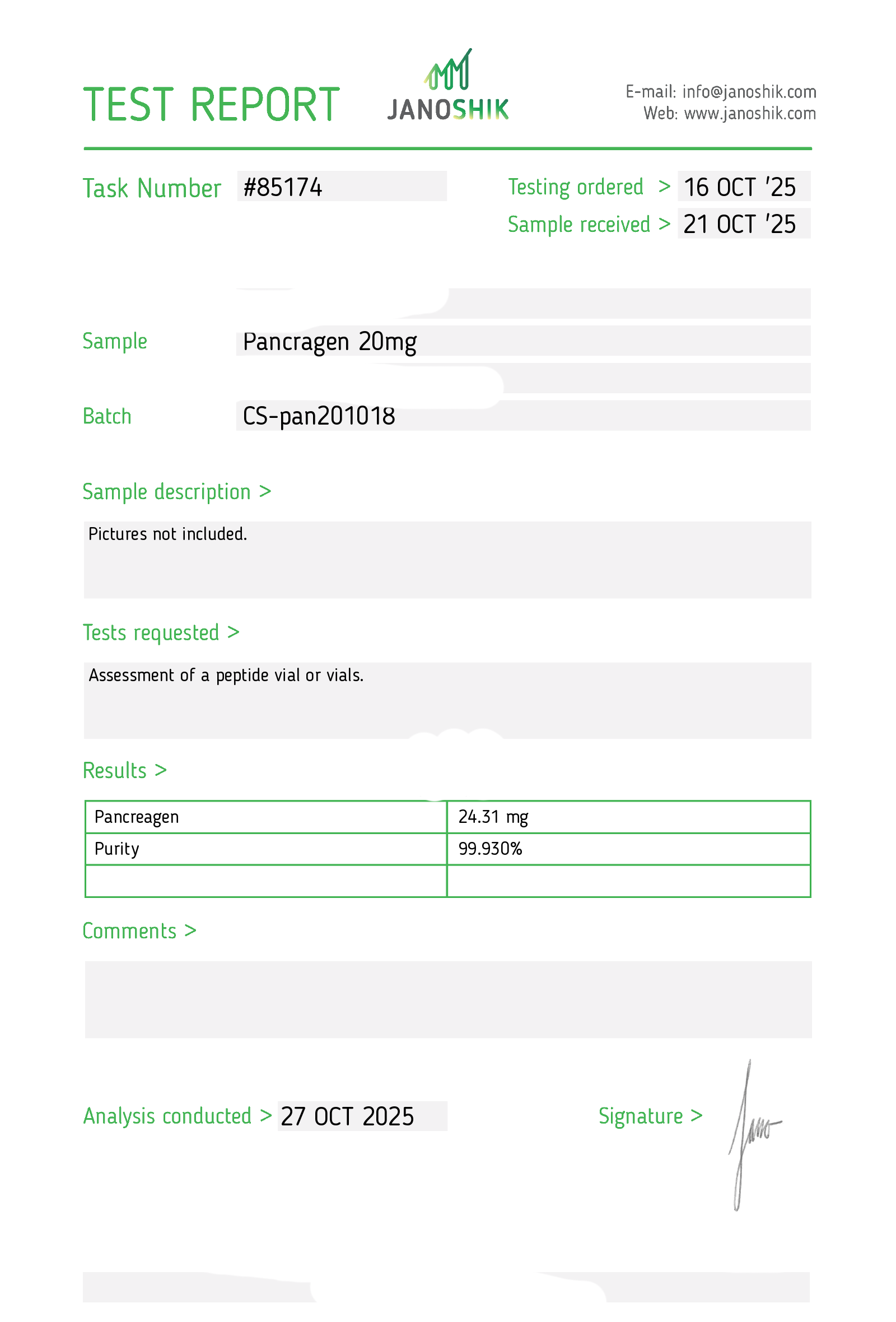 Certificates of Analysis (COA) Certificates of Analysis (COA'S) All products are third-party tested to ensure purity, accuracy, and quality. Bronchogen 20mg View cOA Cartalax 20mg View cOA Epithalon 50mg View cOA Chonluten 20mg View cOA ILLUMINEURO Pinealon/NA Selank/NA Semax/ Pe22-28 50mg (BLEND) View cOA Cardiogen 20mg View cOA N-Acetyl Epithalon Amidate 20mg View cOA Ovagen 20mg View cOA Pancragen 20mg View cOA Pinealon 20mg View cOA ADIPOTIDE View cOA AOD-9604 5MG View cOA ARA-290 16MG View cOA BPC-157 40MG View cOA BPC-157 10MG View cOA CJC-1295, IPAMORELIN 5/5 View cOA CJC-1295, IPAMORELIN 10/10 View cOA CJC-1295 with DAC 5mg View cOA DSIP 5mg View cOA Epithalon (Epitalon) 50mg View cOA FOX04 10MG View cOA GHK-Cu 50mg Copper Peptide View cOA GHRP-2 10mg View cOA GHRP-6 10mg View cOA BPC-157, TB-500, GHK-Cu 70mg View cOA L-Glutathione 600mg View cOA Humanin 10mg View cOA IGF-1 LR3 1MG View cOA Pinealon/NA Selank/NA Semax/ Pe22-28 50mg View cOA Ipamorelin 10mg View cOA KPV (Ac-KPV-NH2) 30mg View cOA LL-37 5mg (CAP-18) View cOA MOTS-c 10mg View cOA Melanotan I (MT I) 10mg View cOA Melanotan II (MT II) 10mg View cOA N-Acetyl Epithalon Amidate 20mg View cOA N-Acetyl Selank Amidate 10mg View cOA NA SEMAX 10MG View cOA NA SEMAX 50MG View cOA NAD+ 500mg View cOA OVAGEN 20MG View cOA OXYTOCIN 10MG View cOA PANCRAGEN 20MG View cOA Pinealon 20mg View cOA PROSTAMAX 20MG View cOA PT-141 10mg View cOA SELANK 10MG View cOA SERMORELIN 5MG View cOA Tesamorelin, CJC-1295 (no DAC), Ipamorelin 12mg View cOA Tesamorelin 10mg View cOA Tesamorelin, Ipamorelin 10mg View cOA Tesamorelin, CJC-1295 (no DAC), Ipamorelin 12mg View cOA Testagen 20mg View cOA THYMOSIN 10MG View cOA VESILUTE 20MG View cOA VESUGEN 20MG View cOA