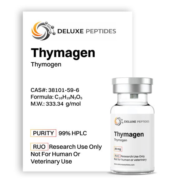 Thymogen 20mg is a synthetic dipeptide (Glu-Trp) derived from thymic tissue extracts and investigated in experimental models for its regulatory activity in immune-related signaling pathways and cellular differentiation mechanisms. As a laboratory-grade peptide compound, Thymogen 20mg is utilized in controlled research settings to explore thymic peptide signaling and transcriptional regulation processes within cellular systems.